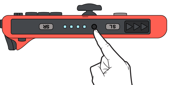 * Tippen Sie erneut auf Zens Bluetooth-Kopplungstaste, und halten Sie dann die **Joy-Con (Rechts) Sync-Taste** gedrückt, und auch dieser wird vibrieren.